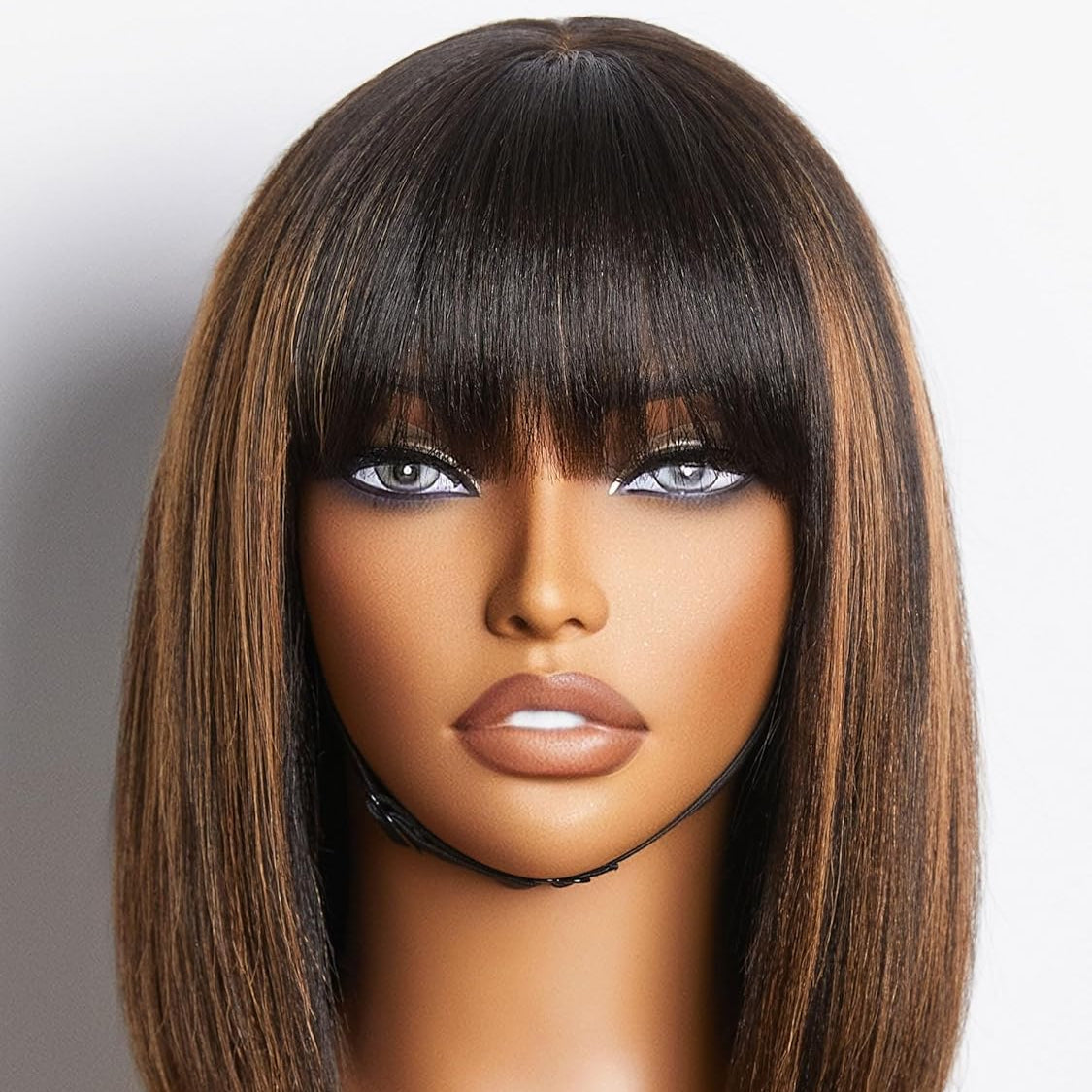 13×6 Yaki Straight Bob Wig with Bangs Human Hair Glueless HD Lace Bob Wig with Brown Highlights